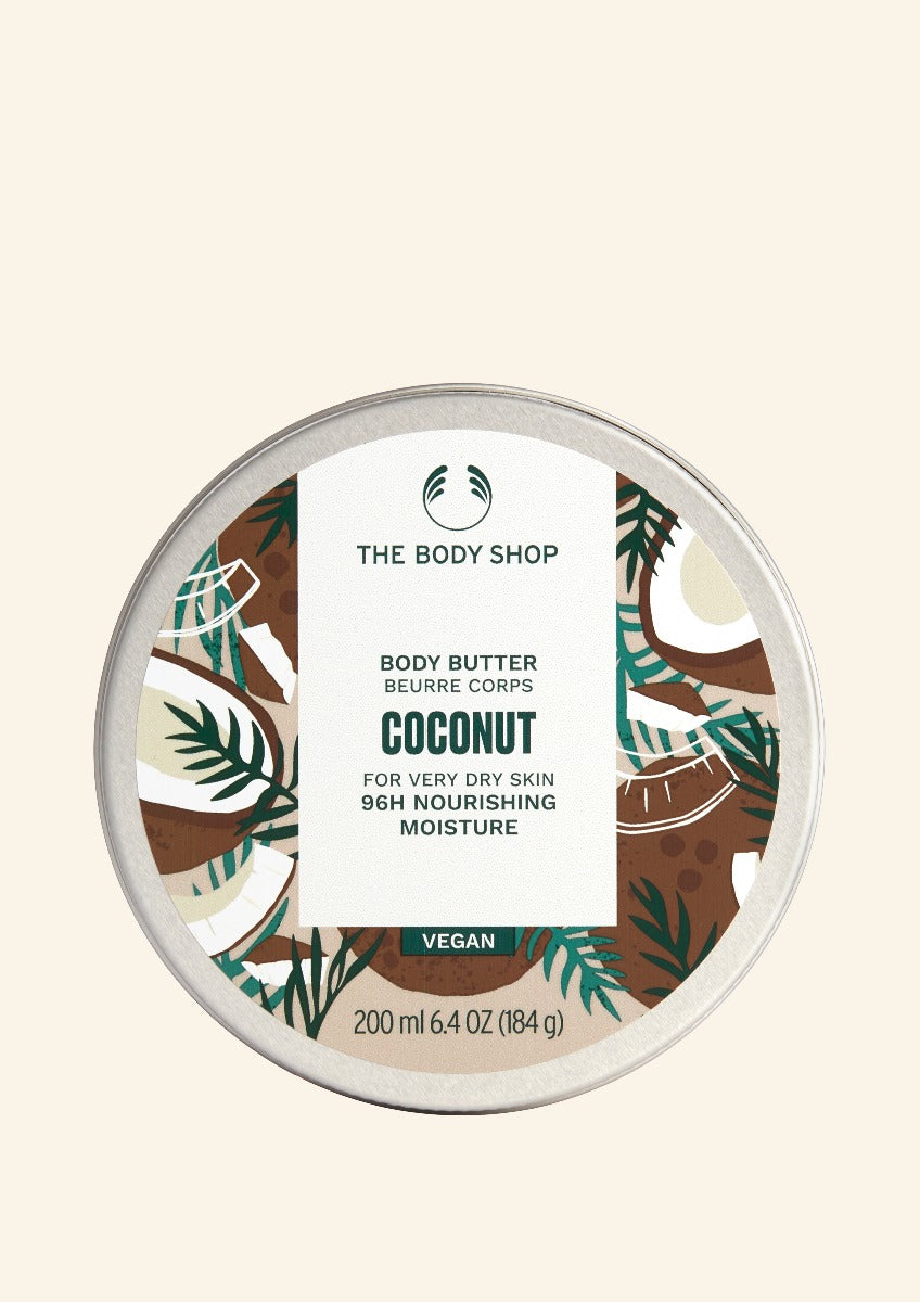 Den er laget med hele 96% ingredienser av naturlig opprinnelse, inkludert Community Fair Trade økologisk kokosnøttolje fra Samoa, Community Fair Trade sheasmør fra Ghana og Community Fair Trade økologisk babassuolje fra Brasil. Coconut Body Butter vil etterlate huden din myk, smidig og rik på fuktighet, og vil holde på fuktigheten i opptil 96 timer. Den gir til og med huden din en naturlig glød.